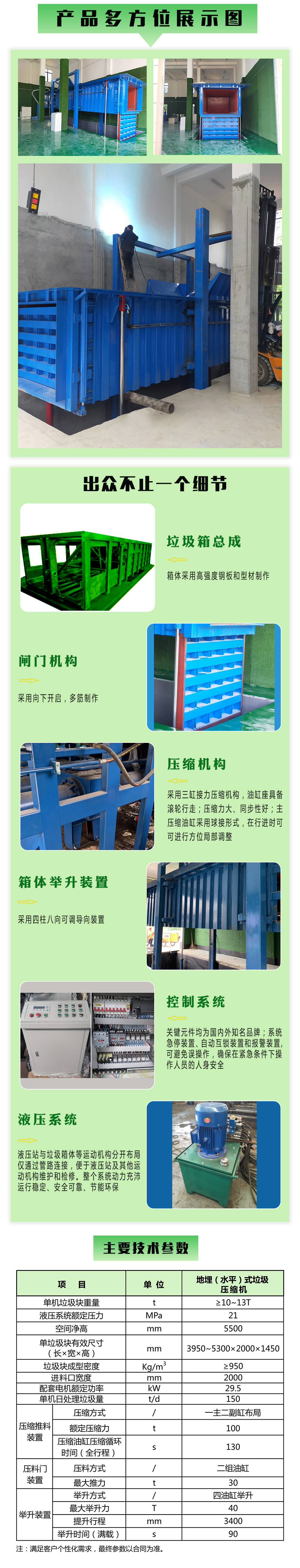 ★占地面积小,选址方便;充分利用地下空间,垃圾压缩、储存在地下进行,仅在与垃圾转运车对接卸料时升起设备。